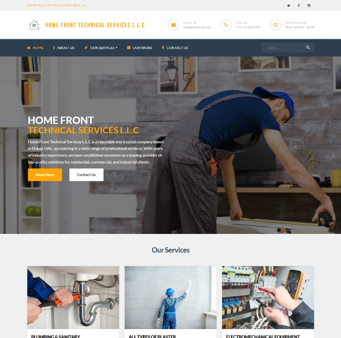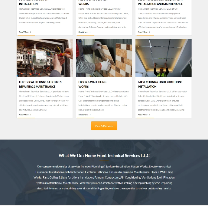 Home Front Technical Services L.L.C is a professional technical and maintenance company offering residential and commercial solutions including plumbing, electrical works, plastering, tiling, HVAC, and electromechanical services. The objective was to design a strong corporate website that clearly presents services, builds trust through credibility indicators, and generates qualified service inquiries.